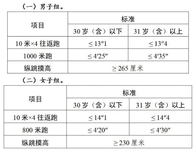 體能測(cè)評(píng)三項(xiàng)全部達(dá)標(biāo)方為合格。其中:縱跳摸高的測(cè)試次數(shù)不超過3次,10米×4往返跑的測(cè)試次數(shù)不超過2次,1000米跑/800米跑的測(cè)評(píng)次數(shù)為1次。