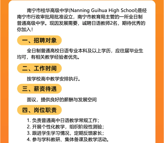 原文標(biāo)題:南寧市桂華高級(jí)中學(xué)面向社會(huì)公開招聘2名日語(yǔ)老師的公告