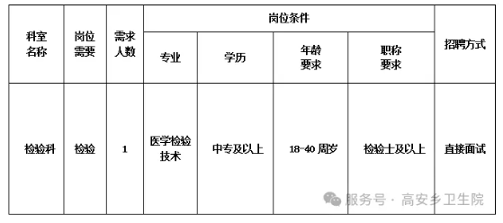 來賓市興賓區(qū)高安鄉(xiāng)衛(wèi)生院是一家集醫(yī)療、預防保健、康復醫(yī)療于一體的國家公立基層醫(yī)療機構,現有職工45人,服務人口約2萬人。因工作需要,我院擬向社會公開招聘編制限額外檢驗科人員1名,現將有關招聘事項公告如下: