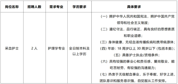 報名所需材料:《河池市中心血站公開招聘報名表》(附件)、個人簡歷、畢業(yè)證書、學位證書、護士執(zhí)業(yè)證/資格證、身份證等,若個人具備特長,需一并附上相關佐證材料。請攜帶以上材料原件及復印件至指定報名地點。應聘人員應對報名材料的真實性負責,凡弄虛作假的,一經查實,即取消報名和聘用資格。