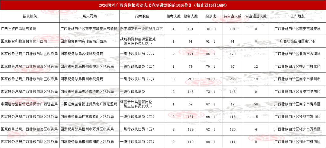 我們接著來看廣西地區(qū)國考報名競爭最激烈的前十職位匯總情況。當前,國家稅務(wù)總局廣西壯族自治區(qū)稅務(wù)局-國家稅務(wù)總局桂林市臨桂區(qū)稅務(wù)局的【一級行政執(zhí)法員(三)】 職位,以220人的報名數(shù)成為目前前十職位中最熱門的選擇。